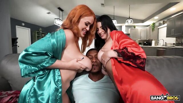 Nia Bleu and Asteria Jade are two hotties with huge tits and big asses. They are getting it on, making out and sucking on their tits. Moments later, they take it from the couch to the shower where they get completly naked and wet. Both get all soapy while they rube each others tits together. Once They get all the soap off their soaked asses, they both go down one each others wet pussies. Meanwhile, Jonathan Jordan,the neighbor stops by and rings the door bell, Nia and Asteria and close to cuming and are begging for some dick, they hear the door bell several times and finally answer the door with nothing but robes on and they don't even bother covering up there beautiful big tits. Jonathan cannot beleive his eyes, but he gets straight to the point and ask's for some milk to bake his cake at home. The horney gal's grab him and pull him inside for his his milk and offer their cake instead. Jonathan will never think to go to the store to get milk again. He pulls out his huge cook and fucks both Nia and Asteria. They both share sucking his huge dick, take turns riding and bouncing their asses on his cock and Nia even gets to eat Asteria's pussy while getting fucked doggy. Nia and Asteria sure do get milk they were missing from the start.