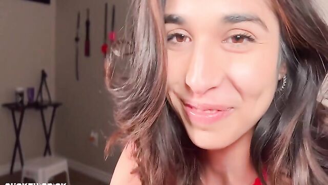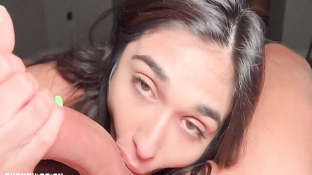 19 year old beautiful porn newcomer Reina Rae is ready to suck this dick. She tells us she's brand new to porn and is here for some dick sucking practice. We start making out on the couch. I switch to POV and she says she really wants to suck this dick. She gets in front of me and starts sucking. I tell her to show everyone how good she is at sucking dick. Tears start to come out of her eyes as she puts the cock deeper down her throat. I tell her to deepthroat it with no hands. She sucks my balls and my cock more and I have her stand up and undress. I tell her to spread her pussy open and sit on my dick.