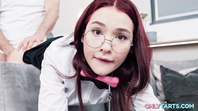 Matty’s stepbrother is a young handsome guy and many college girls have a huge crush on him. Matty is not an exception, and ever since they started living in his father’s house, she has been hanging around trying to get more of his attention. She has been without sex for too long and is super horny. Needing something to get her off, she goes poking around her stepbrother’s things and finds a box with a bunch of sex toys inside. She is curious to try them all and starts playing with a leather collar and the leash. She is so busy and excited imagining herself a fuck toy that she doesn’t hear her stepbrother when he comes home and catches her with his stuff. He is shocked to see how horny she is and decides to take a chance and grab the leash to fuck Matty to a shocked orgasm.