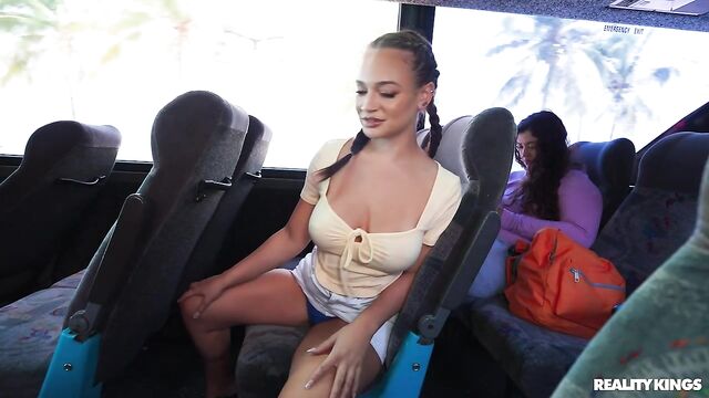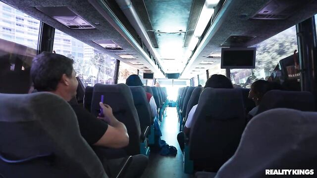 Horny hottie Lexi Victoria notices Kai Jaxon arguing with his girlfriend behind her in line for the bus. When his GF stops speaking to him, she decides to make her move, flashing him her tits across the aisle and putting her rack in his face as she reaches for the luggage rack. She goes to the bathroom and he follows, finding her waiting with her boobs out. Lexi sucks him and sneakily rides him in the back row, then even fucks him right next to his girl!