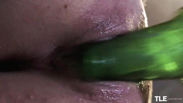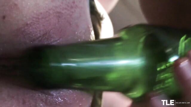 Model and actress-turned-director Sandra Shine brings us an erotic adventure starring sizzling-hot Stella Cardo. The blue-eyed Russian blonde is at a nightclub. Dressed in a ripped denim micro-miniskirt and black cami-tank, she touches up her lip gloss in the ladies room. Then, in the mood for some naughty fun, she sneaks into the men’s room. She finds herself alone and her hands begin to roam over her curves. She frees her large breasts from her top and bra, stroking the bottle between them as she licks and sucks on the neck. Her puffy nipples are already stiff and deep pink with arousal.