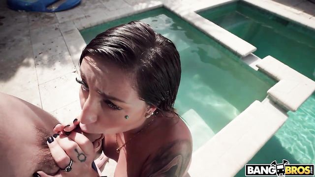 Anna Chambers was showing off her beautiful body and cute ass. Tyler Steel showed up and started to play with her. He poured lots of oil on her young body. She gave him a nice blowjob. Then they fucked. First they started with doggy at the pool. Then she was riding him on the bench. Another BJ. Then some fucking while she was lying on her belly followed by some mish and a load in her face.