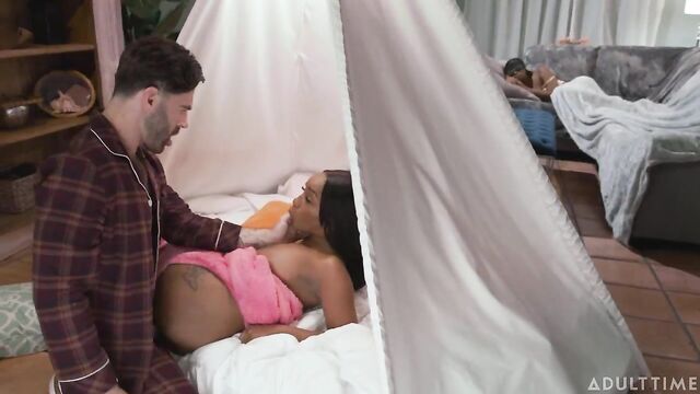 Lily Starfire is hanging out inside a play tent in the living room, making cute drawings on her notepad while her stepparents Ken Feels and Mocha Menage watch a movie on the couch. This would be the perfect picture of family wholesomeness... if it wasn't for Lily getting bored and starting to masturbate secretly in the tent. What she doesn't account for, however, is for her shadow to get cast upon the tent's material, giving her stepdad Ken a tantalizing outline of the naughty stuff she's up to. When she discovers that Ken is onto her, however, she lures him into the tent for some dirty sex right under her stepmom's nose! They have to be quiet, though... the LAST thing they want is for mama to catch them!