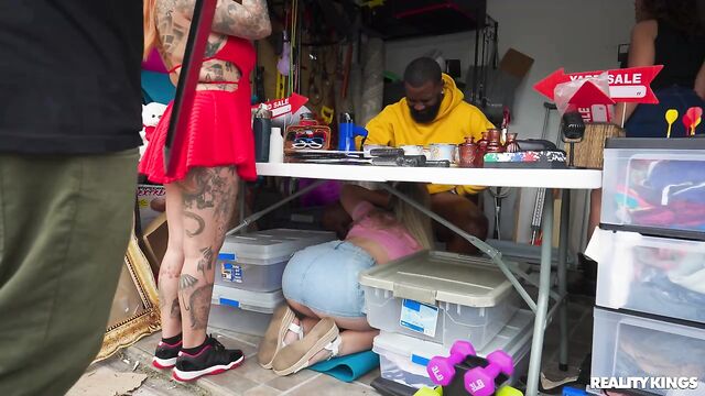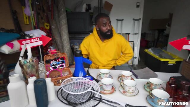 College student Ashley Alexander is a little short of cash for what she wants at Ace Bigs's yard sale, so she decides to sweeten the deal by flashing her pretty tits, then sneakily blowing Ace under the table! They sneak behind a rack of clothes so Ace can pound her pussy right under the noses of browsers. The pair head inside, and Ashley rides him on the couch. She loves getting her hands on Ace's junk!