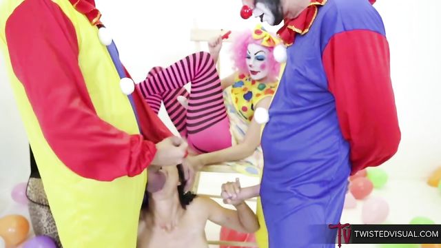 Dana Vespoli is working outside today as a cab driver. She picks up her passengers only to be taken by surprise. Her three passengers are all dressed up as clowns. As they arrive at their destination, the three clowns invited her inside for some kinky sex. Yes, with all three of them roleplaying as clowns. Dana DeArmond, Mark Wood, and Steve Holmes bring Dana Vespoli inside their headquarters. Although Dana is hesitant, the three clowns still convinced her to come. The two guys take over and begin their sexy time with Dana Vespoli as the other, Dana, DeArmond that is watches. Dana Vespoli kneels on the floor, as Mark and Steve take their dicks out, letting her take one after another inside her mouth. She gamely gives both men a blowjob as Dana DeArmond takes off her Dana Vespoli’s clothes. Dana Vespoli is now naked and is positioned with her upper body bent on top of a high chair. The three clowns remained clothed with only the useful body part exposed. Dana DeArmond happily puts her on Dana Vespoli’s back as the men fuck. Steve thrusts his dick into her wet and tight pussy while Mark inserts his big hard dick into her mouth. The two men along with Dana Vespoli transfer to the couch and switch sex positions. Steve now lies on his back with his dick insider Dana’s ass hole. Mark, on the other hand, thrusts his big hard cock inside her pussy while Dana DeArmond gets a dildo and puts it on Dana Vespoli’s mouth. Dana DeArmond wants to fuck Dana Vespoli too. She uses the dildo and thrusts it inside Dana Vespoli’s pussy until all of them are almost at their peak. Steve Holmes fucks Dana Vespoli from behind as Mark Wood fucks her mouth. Dana DeArmond masturbates as she watches them. All of them orgasm. The men released their cum all over Dana Vespoli’s face, who looked really tired after being gangbanged by clowns.