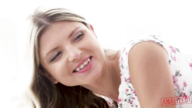 Petite teen Gina Gerson is feeling a little horny while chilling in the living room. The tiny slut starts playing with herself. She brings out her ever-reliable pink dildo and sticks it into her tiny butt. Gina is enjoying herself when a man suddenly approaches her. The all-natural babe is not surprised at all. She immediately reaches for his cock to suck it hard. Gina gives the guy a blowjob until his cock is covered with her spit. The guy bends her over and stuffs his cock into her wet cunt. He fucks the little girl from behind. His balls keep on hitting her swollen clit as he buries his dick balls-deep into her tiny twat. Gina licks her pussy juice off his cock. She smothers his dick with her spit before riding him in a cowgirl position. Gina loves having her pussy fucked. However, this petite babe is a self-professed anal whore. She holds his dick and guides it to her tight asshole. Gina bounces up and down his crotch while his cock slides in and out of her asshole. The horny slut can feel his cock digging deeper and deeper into her anal cavity. She can't help but moan loudly as his penis wreaks havoc inside her anus. Her body starts to quiver uncontrollably as she cums over and over again. The two continue to duck each other, changing positions multiple times. They fuck in doggy style, reverse cowgirl, spoon, and missionary. Gina plays with her pussy while her asshole is being kept busy by his huge cock. The guy lets Gina lick her pussy juice off his cock before spraying his cum all over her face. Some of the thick creams went straight to her eyes. Gina wipes it off and proceeds to clean his shaft with her mouth.