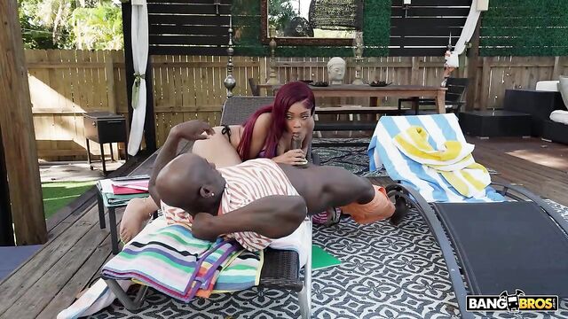 Kay-kay is enjoying some time under the sun and studying. Her step dad walks in and wants her to take a break to play with each other but she wasn't having it, she had to study. He tempts her by whipping his big dick out and you can tell she was biting her lip really hard. He told her to grab his dick while studying and she couldn't last more than 5 seconds doing so, she had to take a break to deep throat her stepdad's cock. Kay-kay has a such a tight, firm body you can tell she works out in between her stepdad's dick appointments. I can look at her ass bouncing up and down for hours, just look at it and tell me I'm wrong. The way her ass shines with oil gets me every time, just look at it!