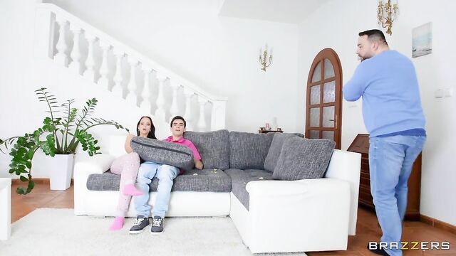 The sexy Jennifer Mendez is lounging in some comfortable pajamas. She thinks she has the place to herself, so it doesn't matter that her pants have a little rip in them. Except, her boyfriend and has pal Jordi come over to watch the big football match and living room is suddenly way too crowded. Jordi quickly notices Jennifer's partially exposed ass and starts staring at it. When he gets an opportunity, Jordi sneakily rips Jennifer's pajama pants to reveal even more of her ass and pussy. The distracted boyfriend is completely oblivious to Jordi fingering Jennifer, and then to Jennifer repaying Jordi with a sneaky blowjob. When the boyfriend leaves the room to take a pesky phone call, Jordi and Jennifer take the opportunity to fuck. Jordi gets to put his big dick in all Jennifer's holes!