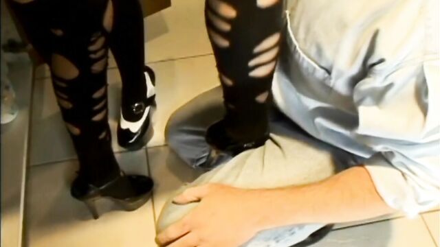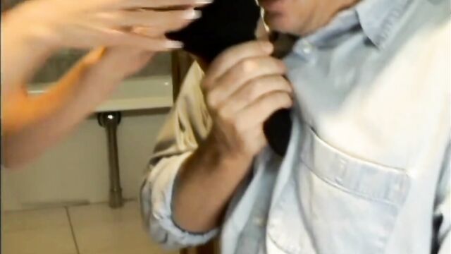 - Description: Two sexy chicks pleasing an older guy's cock with their feet.