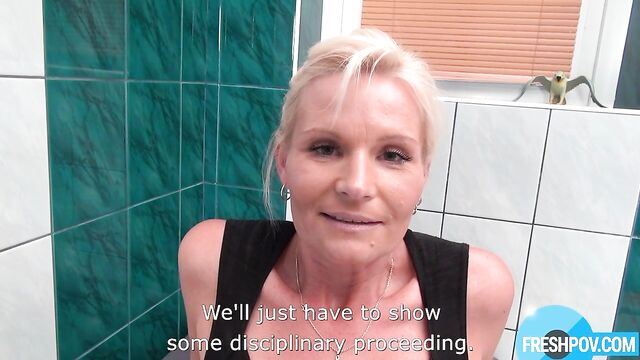 Clarissa Fresh is a hot, mature blonde who thought no one would notice she skipped the panties at work—but she was wrong. Figi catches her bending over in that tight little uniform, shaved pussy flashing with every move. What starts as a teasing upskirt view turns into full-on action. Figi can’t resist—Clarissa gets down and starts sucking cock like a pro. Her natural tits bounce as she strokes, licks, and takes it all deep. Then it’s time to bend her over that desk and pound her from behind, hard and raw. She moans, gets filled, and ends the shift with a sticky cumshot all over her.