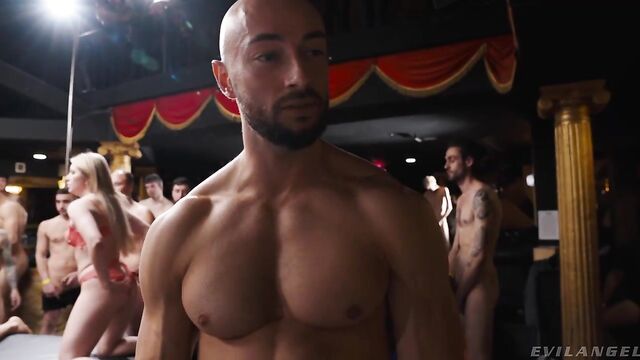 Legendary director Rocco Siffredi meets freaky, busty blonde Rebel Rhyder and five European hotties (Georgia Koneva, Deianira Festa, Paula Boucher, Caro Ortiz, Ada Paradiso) outdoors. Fetish Master Giacon preps hot Rebel for rough sex! On a fun side trip to the Colosseum in Rome, famed MILF Kelly Stafford joins the group, and we see short clips from her legendary career in Rocco's porn. On the beach, Rocco and Kelly regale the group with their adventures. At nightfall, Rebel and the girls go into a decadent club, where 94 horny, anonymous amateur studs await! Master Giacon blindfolds Rebel for ball gag / bondage play. The Euro girls enjoy lesbian play, sucking Rebel's tits and eating her pussy. Master Giacon presses a vibrator to Rebel's clit. Toys drill her asshole to massive gaping! The orgy is on, with Kelly observing. Rebel gives a blowjob. Dudes pair off with girls in a whirlwind of intercourse and fellatio. Women take multiple cocks at once -- double penetration! Cum facials coat Rebel's smile. She takes a double-anal ride while slurping on another boner. The army of men slams pricks into boxes and buttholes. Rebel shares semen with the fully fucked Euro girls. This Bacchanalian culminates with applause for the banged-out dolls, and satisfied Rebel is the center of an all-girl group tongue kiss.