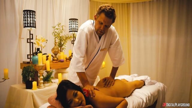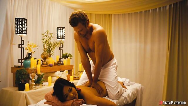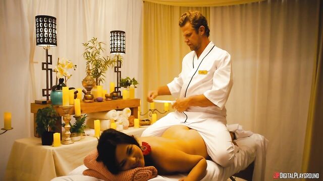 Jess (Scarlett Alexis) hoped that Paradise Pleasures, the sexiest resort on Earth, might save her relationship with her boyfriend Andy, but from the first minute they get there, all he does is sulk and complain... except when gorgeous manager Mia (Texas Patti) gives them some very special attention at the check-in desk. At dinner, Andy pretends to propose as a joke in front of all the guests, and, livid, Jess storms off. While she calms down at the fountain, hunky masseur Sven (Vince Karter) offers her a rubdown to make her feel better, and the sensual touching soon turns sexual as Sven's hard cock appears in front of her lips. Jess sucks him and squirts as he fingers her pussy, and she feels much better after an athletic fuck! Maybe this vacation isn't ruined after all...