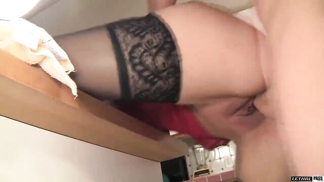 Gourmet Evan Stone brings lusty Roxanne Hall a fresh bowl of greens. But when she hears the word salad and gets a whiff of Evan, Roxanne quickly has him bent over the counter and takes a hungry lick and suck of his anus. She fills her mouth with his ballsack from behind, until his cock is raging and ready. Then she lays him out on the kitchen island and rides him for a few quick orgasms. Jerry then takes command and pumps her from above while she screams at the nutritious cock she's receiving. Roxanne can't resist one more lick of evan's sweaty bunghole before getting her final pumps back on the island. She sucks him off to a heady finish before finally getting her own salad.