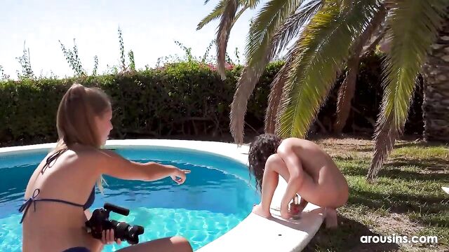 In Arousins’ Helina Rides Big Dildo at the Pool - Behind the Scenes, brunette babe Helina Dream sizzles in a skimpy bikini by the pool. This shaved beauty teases her natural tits, then grabs a massive dildo for a solo action show. Outdoors, she spreads wide, plunging the toy deep into her wet pussy, moaning as she grinds to orgasm. The glamour vibe turns filthy as she works the sex toy, her body glistening under the sun. Peek behind the scenes for raw, unfiltered moments of Helina’s lusty masturbation, leaving her dripping and satisfied in a steamy poolside spectacle.