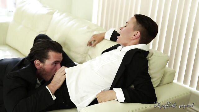 Jiz Lee is practicing their dance moves for a wedding when a man dressed exactly the same as them pops out of nowhere next to them and starts making out with them. The mysterious man automatically reaches for their crotch as they continue to make out. The man slowly moves south and unbuttons Jiz’s pants, feeling their hairy pussy and then sliding his fingers into them. He continues to move south; his mouth reaches the crest of their pussy and he begins to lick their clit as they lightly moan. He licks all the right places as their back comes off the couch and their head hangs over the armrest, he calms them by kissing them then choking them, but then continues down to their pussy. The mystery man rips their shirt open and grasps their tits firmly in his hands while he tongue fucks their pussy and they scream in ecstasy. Jiz climbs atop of him and kisses him and releases his cock from his slacks and jerks him off before sliding his cock down their tongue and to the back of their throat. They masterfully handle his cock in their two hands and gags on it for their masochistic pleasure. Jiz moves up to kiss mystery man and he slides his cock into their throbbing hairy pussy. They gasp and moan and caress his face and hair with care as he slowly strokes in and out of them. They removes his cock from their pussy to climb atop of him and ride him cowgirl style, he smacks their ass until it's red and welted and fucks them fiercely. Jiz takes control and grinds him with gross ferocity and velocity. Mystery man picks them up and slams them on the other side of the couch and rams his cock in them to their surprise they shriek at the sudden stretching of their pussy. In and out, he fucks them fast and raw, spreading their legs wide open to feel his cock deeper in of them. He grabs and squeezes their tits and chokes them until they become red and gasping for air. Jiz hasn’t been fucked with such animosity and animalistic prowess. He bends them over the armrest and fucks them doggystyle. They look back at him and smiles at his pelvis slamming against their ass. He continues to barrage their ass cheeks with spanks until their ass is raw, red, and welted with handprints left on it. The mystery man can feel his load coming and jerks off until he cums all over Jiz’s back.