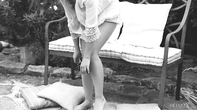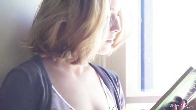 Pretty Lucretia K sits reading, her mind full of wild imaginings. She pictures herself stripping outdoors, squeezing her beautiful breasts and stroking her shaved pussy. As she gets carried away by her erotic thoughts, she touches herself through her panties, and tugs her top aside to tweak her nipples stiff. Licking her fingers, she rubs her clit in increasingly frantic circles, plunging her fingers deep as her horny masturbation reaches fever pitch. Naked, she returns to her book with a glow of sexual satisfaction.
