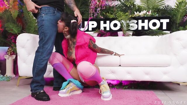 Dressed in sporty, colorful garb -- windbreaker vest, fishnet tube top, cut-off shorts, shin pads and sneakers -- short-haired brunette Ravyn Alexa flashes a wide smile during a fast opening tease. Alpha stud Nade Nasty helps himself to her rockin' bod. He plays with her breasts and smacks her ass. Ravyn drools onto her big tits. Nade removes her net panties. The tattooed alt-girl services him with a deepthroat blowjob. Nade puts her on her back to eat her slit. He drives his prong into Ravyn's wet cunt and fucks it. She flashes a peace sign while she fellates an enormous, clear dildo. Nade chokes Ravyn while he drills her asshole. He delivers a series of face slaps to the submissive doll, and a thrusting titty fuck. Ravyn takes a doggie-style buttfuck and more anal reaming. He porks both pussy and butthole, pile-driving her into the floor -- she loves rough sex! Freaky Ravyn expertly rims Nade. Finally, dominant Nade jerks jism onto her forehead. The juice streams down, bathing Ravyn with a fitting cum facial.