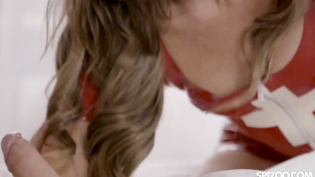 Sarah Sultry is a seductive hottie in a sexy red latex nurse costume. The gorgeous blonde has more than what it takes to treat her handsome patient, Michael Fly. Without wasting any time, the naughty caregiver starts giving Michael a sloppy blowjob. The sensual head makes Michael feel a lot better. He then returns the pleasure by giving Sarah an intense pussy licking. The horny duo can't resist the urge to be one any longer. Moans of delight fill the room as Michael bangs Sarah's bald pussy in missionary and doggystyle. Sarah's small natural tits gracefully bounce as she rides Michael's cock in reverse cowgirl. The naughty hottie tirelessly grinds on top of the horny lad before letting him cum all over her beautiful face.