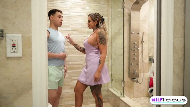 Stephanie Love is a busy and hard working Stepmom. She cooks , She cleans and satisfies her mans needs always. She would love to get some alone time where she can chat with her friends, go shopping with her friends. Her husband gives her space. There is just one problem. Her stepson is horny as fuck. He watches her when she eats, when she cooks and even when she . Today he's got that look in his eye. He's horny for big tits and bouncy ass. I can't even take this phone call. Every now and then you've got to let your stepson sample the goodies. Johnny is the luckiest stepson on earth right now