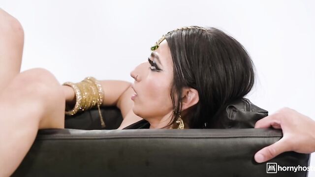 Aaliyah Yasin sits on a talk show to promote her new film, flanked by her makeup artist, Jesus Reyes, and a quiet assistant. The host’s smug questions grow increasingly annoying, prompting him to briefly leave the set for a commercial break. Within seconds, Aaliyah signals Jesus, who pulls the assistant to her knees. She gives him a quick sloppy blowjob, while Aaliyah watches and touches herself, then she is dismissed. Aaliyah immediately strips, mounts Jesus on the couch, and rides him. The host returns, shocked, as they continue fucking and all he can do is watch.