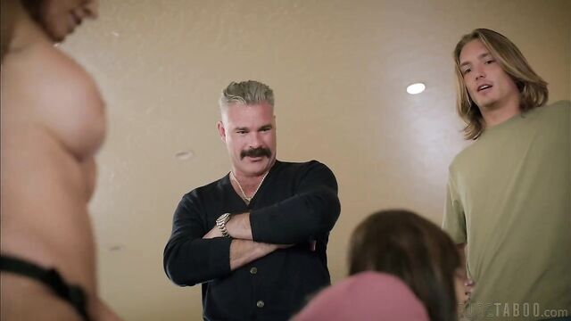 A teen girl, Diane (Rissa May), packs her bags while her stepmom Maura (Reagan Foxx) argues loudly with her stepdad Frank (Charles Dera) and her stepbrother Scott (Axel Haze) in the next room. It's revealed that Maura and Diane moved in with Frank and his stepson Scott after Maura got divorced and remarried. What this led to, however, is a toxic environment where both men have been making sexual advances on Diane. At this point, she's had enough and decides to run away. She begs her stepmom to come with her, but Maura is too scared to leave and be out alone in the world again, so Diane leaves her behind.A few months later, however, Diane returns in defeat, unable to survive on her own. She's let in by her stepmom, who dryly invites her inside, her eyes filled with resentment. Diane learns that Maura has had to endure Frank and Scott's behavior all by herself- especially considering that once Diane left, they turned all their frustrations onto her. Maura has grown to accept this, but still blames her stepdaughter for abandoning her in the first place.Diane begs for forgiveness and asks to be accepted back into the family, something which Maura will consider only on one condition: Diane needs to submit herself sexually to her and the rest of the family's whims. Diane accepts, pulling down her shorts while Maura dons a large strapon. Maura fucks her stepdaughter in the ass, and when the two men arrive home, they hungrily join in as well. This leads to a filthy foursome where the men relish in having Diane come back to be their little sex slut, honoring the occasion with a family sex train.