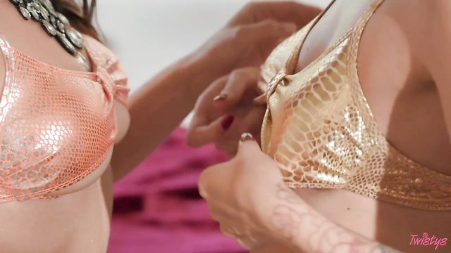 In their sparkly eyeshadow and shiny bikinis, red-haired Charlotte Sins and brunette Spencer Bradley can't take their eyes off each other. These babes kiss passionately, and Spencer pushes Charlotte's top up so she can suck the redhead's pierced nipples, then they take turns licking each other's pussies. Spencer moans with pleasure as she sits on Charlotte's pretty face, then it's the redhead's turn to enjoy the same treatment. Spencer gets loud as Charlotte licks her ass while fingering her pussy, and all she can say is, "Wow!"