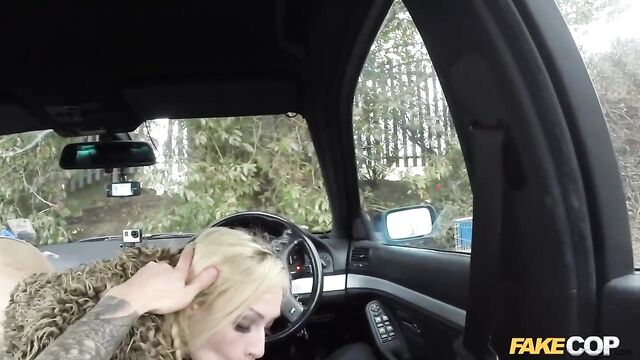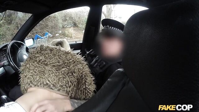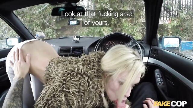 So there I was just minding my own business, sitting in my cop car just about to get something to eat when this fucking dozy blonde bumped into my car with her fucking shopping trolley. I could;t fucking believe it. She could not give a shit about what she had one, so I got her in my car for a chat. I tried to explain to her that she HD just committed criminal damage by hitting my police car with her trolley. She was not listening to a fucking word I was saying. She was to busy getting her tits out in front of my on-board cameras. She explained that she liked being filmed. She told me that her boyfriend films her when she sucks on his cock. well this conversation was only going one way. She came and sat on the front seat and started sucking on my policeman helmet. She had amazing blowjob lips and she really turned me on when she looked me straight in the eye with my cock deep down her throat. I needed more than a blowjob from her. I put my cock away and drove her to a car scrap yard that I’ve taken a few other women for a fuck. This busty blonde was more than happy to be bend over some rusty old cars while I fucked her from behind.