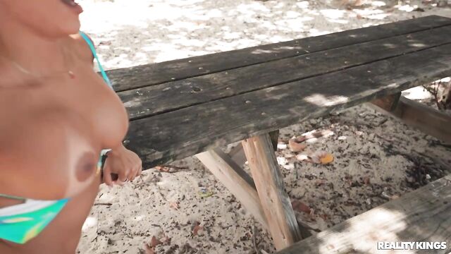 Dickdealer Don is trying to get changed in the beach parking lot, but just as he drops his towel, Brandy Salazar walks by with her BF and gets an eyeful. She's clearly still thinking about that D on the sand as she flirts and eyefucks the lucky stud, and she soon ditches her guy to find a quiet spot with Don to fuck! After Don drills her pussy, she tells him to put it in her ass too, and he's more than happy to oblige. Brandy gets a face full of cum before heading back to her boyfriend, who's still none the wiser.