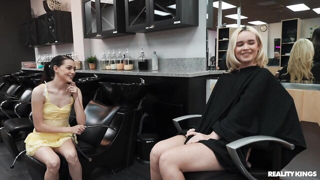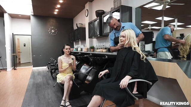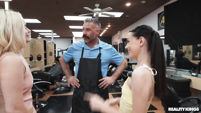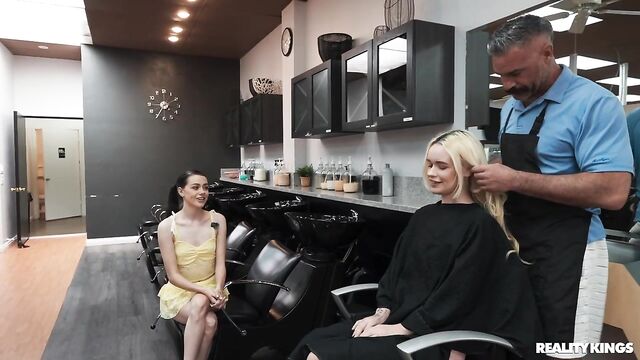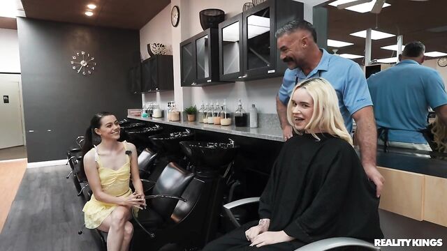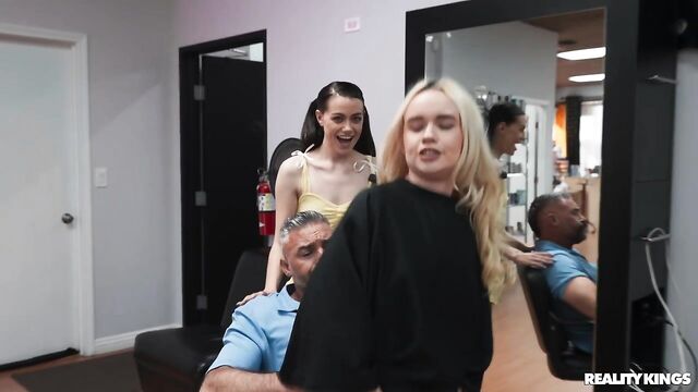 It's a very special video from your fave girl streamers, because it's blonde Khloe Kingsley's 21st birthday! Before their big night out, dark-haired Selena Love has brought her bestie to the salon for an appointment with famous stylist Charles Dera. The hairdresser's talented hands make Khloe so horny, she has to sneak to the bathroom with Selena to fool around. When Charles knocks on the door, they ask him to help, and soon both babes are sucking his cock! Charles knows all the spots where they can have sneaky sex in the salon, and the babes share his dick. Best birthday ever!