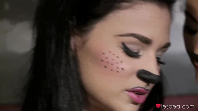 Ivy and Keira are mystical cats whose kitten ears and devilish eyes sparkle unnaturally in the dim and spookily decorated room. They lick each other and once they start to remove each other's cat suits, revealing gorgeous all natural tits, the felines have become very interested in each other. One brunette cat pulls out a very special toy: a giant butt plug with an enormous furry tail. She inserts into the other girl's asshole, who moans and groans with the pleasure and effort of the anal insertion. After both cats have explosive orgasms from finger banging, they go back to their seemingly bored feline ways, licking their paws seductively.