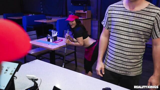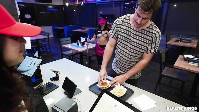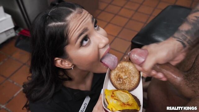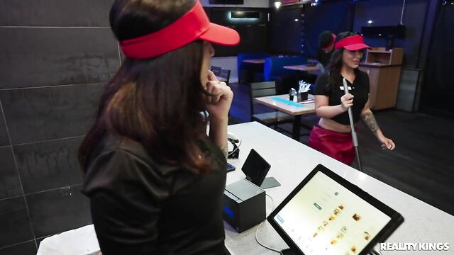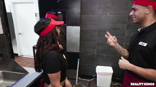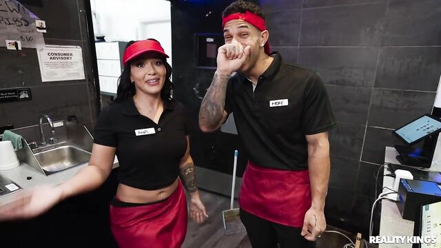 No matter how much their annoying boss tries to get them to keep it professional, the staff at this fast food place would much rather play around... and play with each other! Anais Amore shows her tits and ass to her coworker in the bathroom, but after they're interrupted, she offers to have some fun with Mike Ox instead. She sucks his sausage in the kitchen and he bends her over a stool to fuck her, then she throws back her big, tattooed booty as she rides him on a food-prep surface! Mike covers her face and a burger with cum.