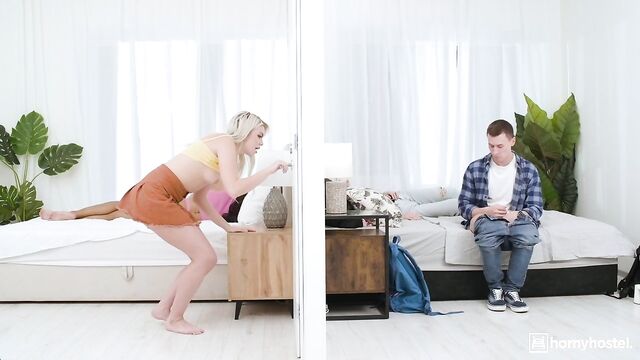 Lia Lin and Winter Ashby were in for a surprise when they checked into the hostel and discovered an adjoining door to another room. Finding it amusing, they left a cheeky gift for their neighbors before indulging in some steamy action. Lia was eager for more, but Winter needed a break. As Lia listened at the wall, she heard something intriguing. It turned out to be Charlie and his girlfriend in the next room. Who would have thought that sexual frustration would bring them all together? Lia couldn't resist the sounds coming from Charlie's side. When she tried to open the adjoining door, the door knob feel off which created an opportunity - a glory hole. This unexpected turn of events opened up new possibilities for some discreet fun. Winter eventually caught on, and Lia suggested that Charlie's big dick could satisfy them all.