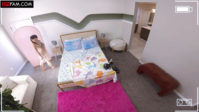 Stepsis pretends to be sick so she doesn’t have to take her mom to the airport. Instead she’s taking sexy selfies in lingerie for her boyfriend when she gets caught by her stepbrother!
