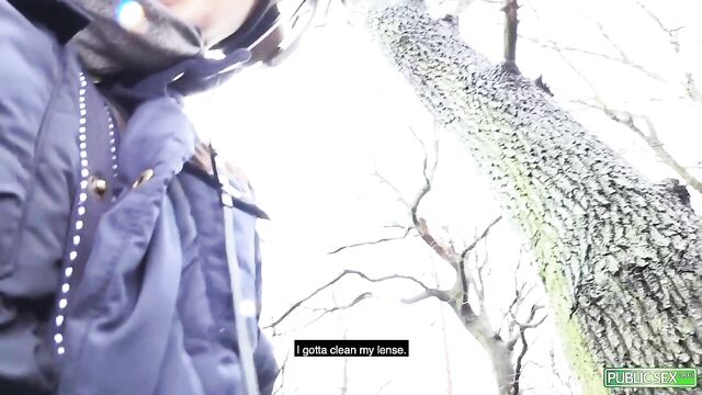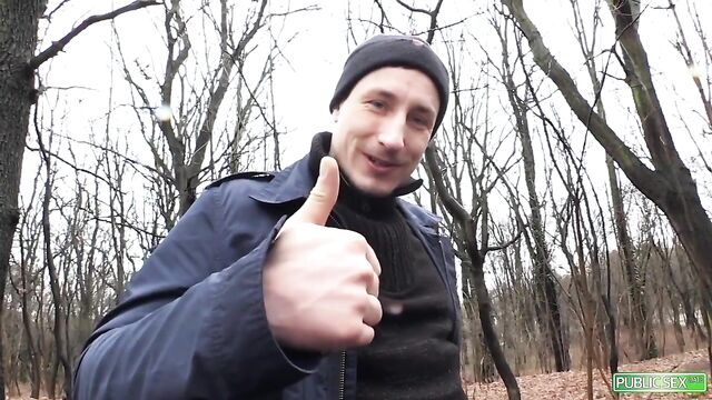 All-natural nerd, Stella Star, meets with her online match outdoors. Although it is their first time meeting each other in person, Stella feels comfortable already with her date. She rides in his car without any hesitation and goes with him in a secluded wood park. Stella knows what her date wants, so she lets him take the initiative. The new couple walks for a while until the man can't control his lust towards the nerdy slut any longer. The cold weather didn't stop this horny duo from exploring each other's body. Stella shows off the beauty of her tiny tits, bubble butt, and enticing cunt. Stella gets down on her knees and gives her man a sloppy public blowjob. She uses her soft lips and warm tongue to slobber the huge cock. After making sure that every inch of the big shaft is wet with her spit, Stella bends over on a tree. She lets her man fuck her tight cunt from the behind. The horny nerd can't help but let out soft moans as her date fucks her doggy style. She cleans her pussy juice off the cock before lying down on the ground. Stella doesn't care anymore that they are in a public area. She spreads her legs wide and lets the lucky guy bang her in the missionary position. The horny stud keeps pounding his cock into Stella's tight cunt in missionary and doggy style. He shows no sign of stopping until he feels like he is about to cum. The man pulls out his throbbing cock from the wet cunt, and showers Stella's face with his warm cum. The couple quickly fixes their clothes and acts as if nothing happened. Stella has a huge smile on her face as she feels the aftermath of the intense public fuck and facial.