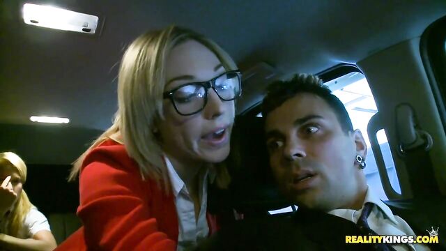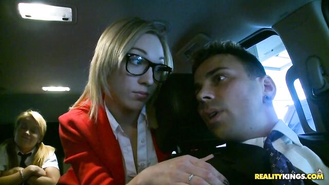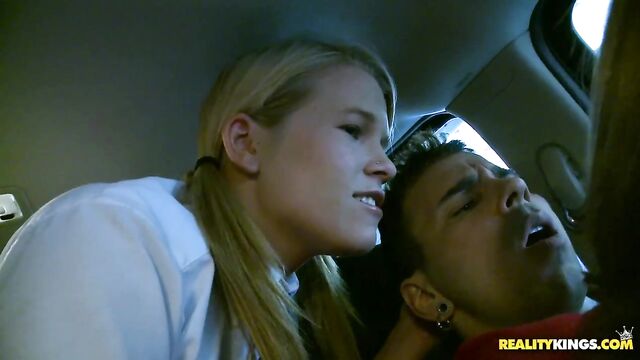 Aiden and Lily were about to go to school, but they had a big test that they did not study for and were trying to find a way out of it. Their driver was about to take them to school when Aiden had a talk with him. She seduced the driver to not take them to school by stuffing his cock in her mouth. She sucked that cock well and the driver was persuaded not to take them to school. They continued the action in Aidens bedroom, where Aiden placed her pussy on his face while Lily sucked his cock well. They took turns getting their pussies pounded and got man juice all over Aidens pretty face and Lilys sweet pussy. No school today.