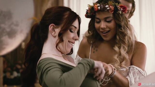 Description: Morgan (Nala Brooks) arrives at the house prepared to drag her friend Sara (Lilith Grace) away from the cult by whatever means necessary... but she wasn't ready for the possibility that Sara wants to stay! Leader Kai (Vince Karter) assures her she and Sara can leave anytime they wish, but persuades Morgan to stay for dinner before making up her mind. Watching the beautiful acolytes who all seem to truly care for each other starts to give Morgan a change of heart, and when beautiful redhead Serenity (Chloe Foxxe) strips off her robe and crawls to her, ready to show Morgan their special version of enlightenment, it's not long before Morgan is getting licked by Sara and Serenity and then taking the guru's cock. Will Morgan still want to leave after the enlightenment orgy, or will her doubts about Kai melt away?