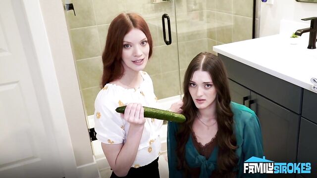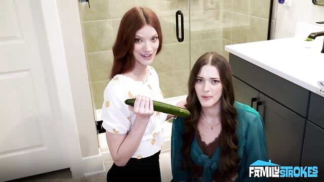 A girl at school spread a rumour about me, saying that I'm bad at sex. I asked my stepmom and stepsister for help, but it turns out my stepsister was going through the same thing. How do I know? Because I caught our stepmom teaching her how to suck a cock with the biggest cucumber I've ever seen! Based on what I can tell, I don't think she needed much help, but since I was there, my stepmom thought it would be easier to show her how to do it if she sucked my dick. My stepsister learned how to give a blowjob like a pornstar in no time. When it was my turn, my stepmom wore a strap-on dildo and pounded my stepsister, teaching me how to move to make her cum and fuck her harder. Once I saw her do it, it was my turn to try it with both of them.