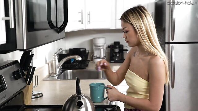 Sexy blonde Asian slut Lulu Chu is so horny that as soon as she arrives at a friends house, she immediately pulls her vibrator out and starts rubbing it all over her tight little pussy. After a few minutes of alone time Lulu is ready to have a big thick cock inside of her. She insists on licking and sucking him off before letting him pound her wet pussy.