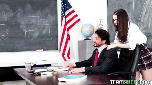 Nikki was going to get some help from her teacher after class but he was on the phone with his wife. She overheard him talking about how they are never intimate anymore so she took advantage of what she heard and made a deal with Mr.Gunn! If he helps Nikki out, shell help him out! Nikki took out the teachers meat, licked it and sucked it like a pro! She was desperate and hungry for her teachers big dick inside of her. Mr. Gunn bent Nikki over the desk and pounded into her tight 18 year old twat! Finally she got on her knees and happily accepted his load to her face!