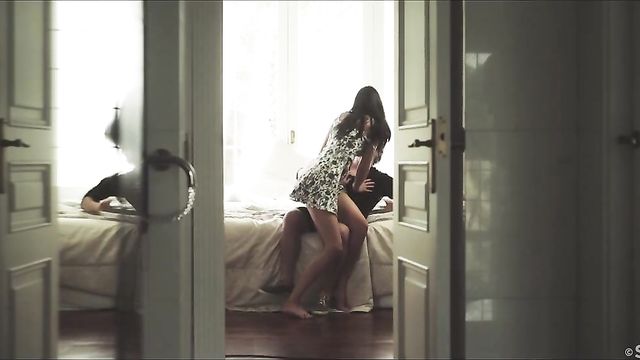 Sexy brunette Leanne Lace gazes out to sea, as Andrej Lupin's erotic movie 'Girl In The Window' begins. She spots Ryan Ryder passing by and invites him in, greeting him with a kiss that quickly turns heated. Sliding down the top of her pretty dress so he can suck her nipples, she pulls off Ryan's shorts and takes his rapidly-stiffening cock in her mouth. She sucks and strokes it avidly, then straddles him, grinding against his dick until he can't hold back any longer and tugs her panties aside to thrust into her hot pussy. She rides hard, pausing only to get naked, her gorgeous ass rising and falling in his lap. Glistening with sweat in the Spanish heat, they move into missionary, Leanne moaning with pleasure as Ryan powers into her. They switch back to cowgirl, slamming together until she is overwhelmed by an intense orgasm -- and then a second, as he fills her with his creamy load.