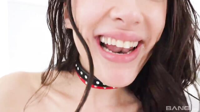 Tattooed brunette Sage Hunter rocks a double-studded choker, tiny top, studded velvet red panties, and black and red high heels, as she gets all oiled up and fucked like crazy! Watch her lather up her tiny tits, bubble butt, tight asshole, and fat pussy with oil before deepthroating a massive cock. She goes down on that cock like there's no tomorrow, face-sitting and getting fucked every which way, moaning like the horny slut she is. Her fat pussy gets thicker with every thrust of that cock!
