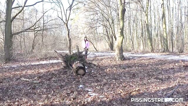 - Description: Sexy brunette with hairy pussy peeing in the forest behind a tree