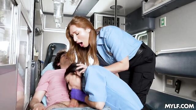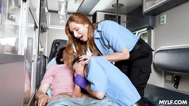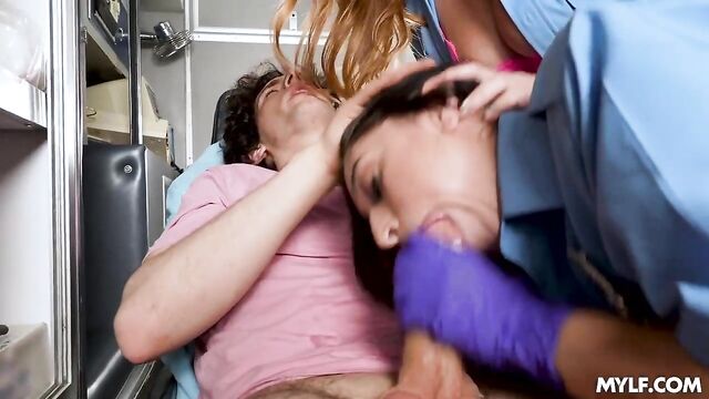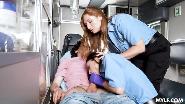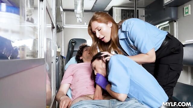 Alexa was new to the job and found it somewhat boring, but Skylar knew it wouldn't take long for things to get interesting. They received a call, rushed to the scene, and found Nick trapped under his bike after a pretty rough fall. But that’s not all they saw: this dude had a massive boner too! It was clear he wouldn’t make it to the hospital with that thing, so, honoring their paramedic oath, they assumed the responsibility, milking his cock like there was no tomorrow.