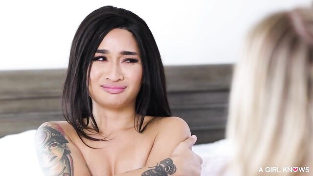 Spencer comes back saying she forgot something. She hears something suspicious and heads towards the bathroom. Avery makes it up to the bedroom in time to see Avery, seemingly alone, toweling off. Spencer gets horny and starts hooking up with Avery. Avery kneels at the edge of the bed and starts going down on Spencer. We then learn that Scarlett is hiking under the bed. She starts fingering and down on Avery without Spencer realizing. Eventually Scarlett gives herself away and Spencer realizes she is there. She demands to know who Scarlett is and why she is under her bed. Avery thinks fast on her feet and tells Spencer that Scarlett is a girlfriend of her that she convinced to come in for a threesome.