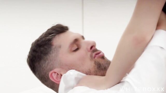Stunning blonde Jade J'Adore lounges on the bed, sensually teasing Krystof as he watches intently from a chair across the room. She slowly strips, revealing her body and small, perky tits, building anticipation with every graceful move. Jade approaches him seductively, freeing his already erect cock from his pants and treating him to a slow, passionate blowjob. Krystof reciprocates by licking her dripping wet pussy, preparing her for intense pleasure. They shift to spoon position on the bed, where he slides balls deep inside her, thrusting smoothly as their bodies press close in intimate rhythm. Jade mounts him in cowgirl, riding with elegant control while her small tits bounce enticingly. The passion escalates as they switch to doggystyle, pounding her pussy with steady, powerful strokes until Krystof pulls out and unloads a warm cumshot across her perfect ass.
