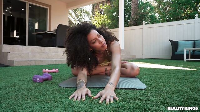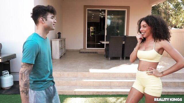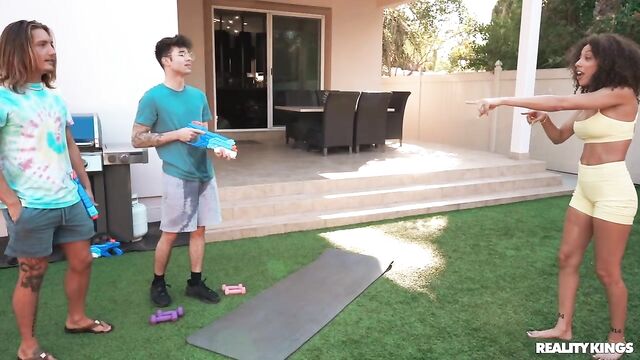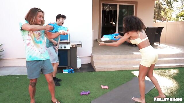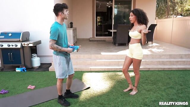 Frecklemonade is just trying to do some yoga outside when she gets caught in the middle of her cousin's water fight with his buddy, Enzo East. The hot yoga babe tells the guys off, but when Axel leaves to take a call, Enzo decides to shoot his shot, and Frecklemonade is DTF! She sucks him and rides him outside, then they fuck hard in the bedroom and he sprays her face with cum.
