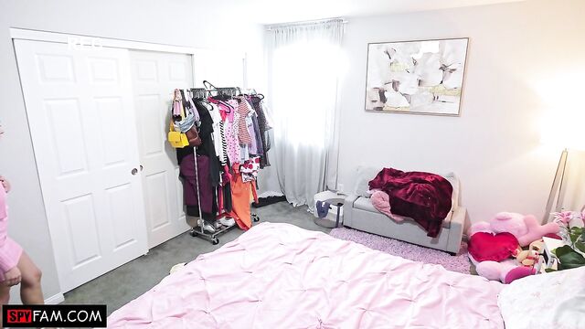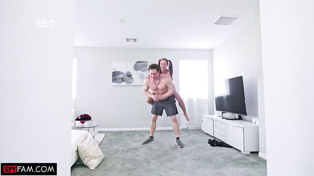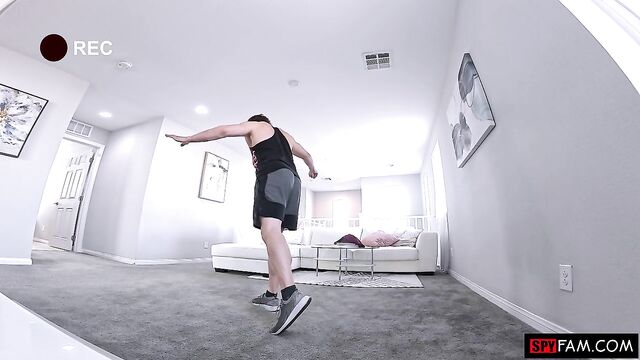 Stepsis creeps on her stepbrother as he works out in the living room. She puts on her skimpiest outfit to tempt him into fucking her!