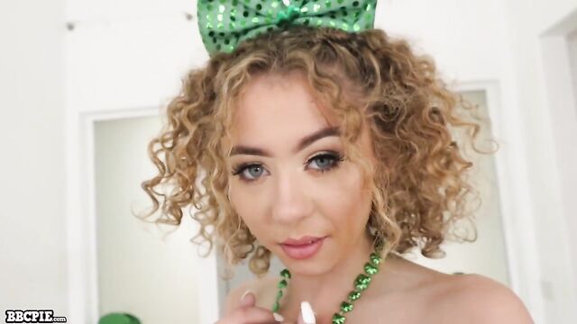 Allie Addison is all dressed up for St Paddy's Day and is ready to have her holes stretched out by a big black cock. Allie sucks on her dildo getting it soaking wet before putting it inside her. Once Allie is dripping wet, she insists on tasting his huge dick before he crams it inside her and creampies her tight little pussy.