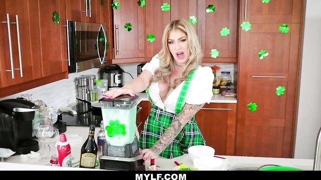 Sexy blonde MILF Lolly Dames is dressed up for a St Patricks Day fuck celebration. After Lolly has a taste of cock she climbs her big juicy ass on top to ride his big hard dick. Watch as her meaty pussy gets stuffed while her glorious ass bounces around. Once Holly's pussy is satisfied and dripping wet she pulls out her big tits and catches a fat load.