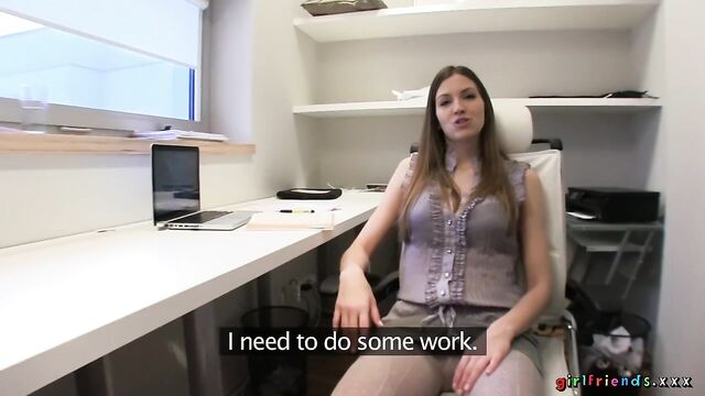 Description: Tracy is bored. Eufrat is having another one of those days of doing nothing but work. Stuck outside with just a coat and nothing else, she tries to get some attention by showing Eufrat what she is missing out on. Tracy ventures in to the office. Before too long, using her powers of seduction, she peels off her clothes and gets Eufrat suck on her perfect tits and then to go down and lick her hot, wet pussy.
